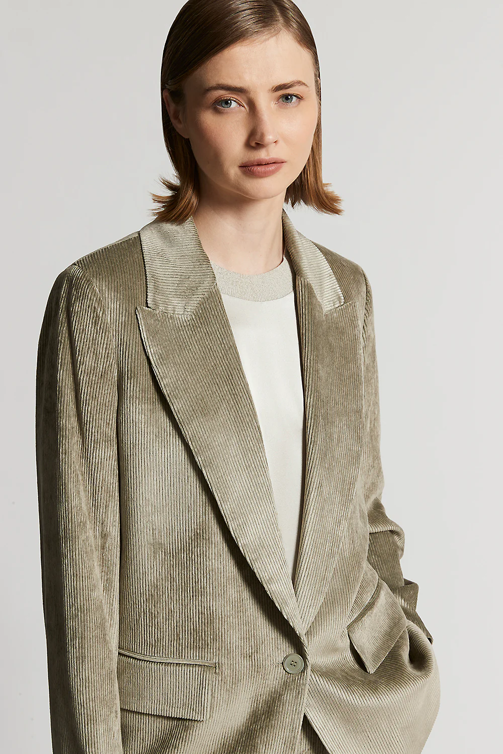 Questo blazer monopetto è realizzato in velluto 1000 righe di viscosa stretch fluido, un tessuto avvolgente e confortevole.